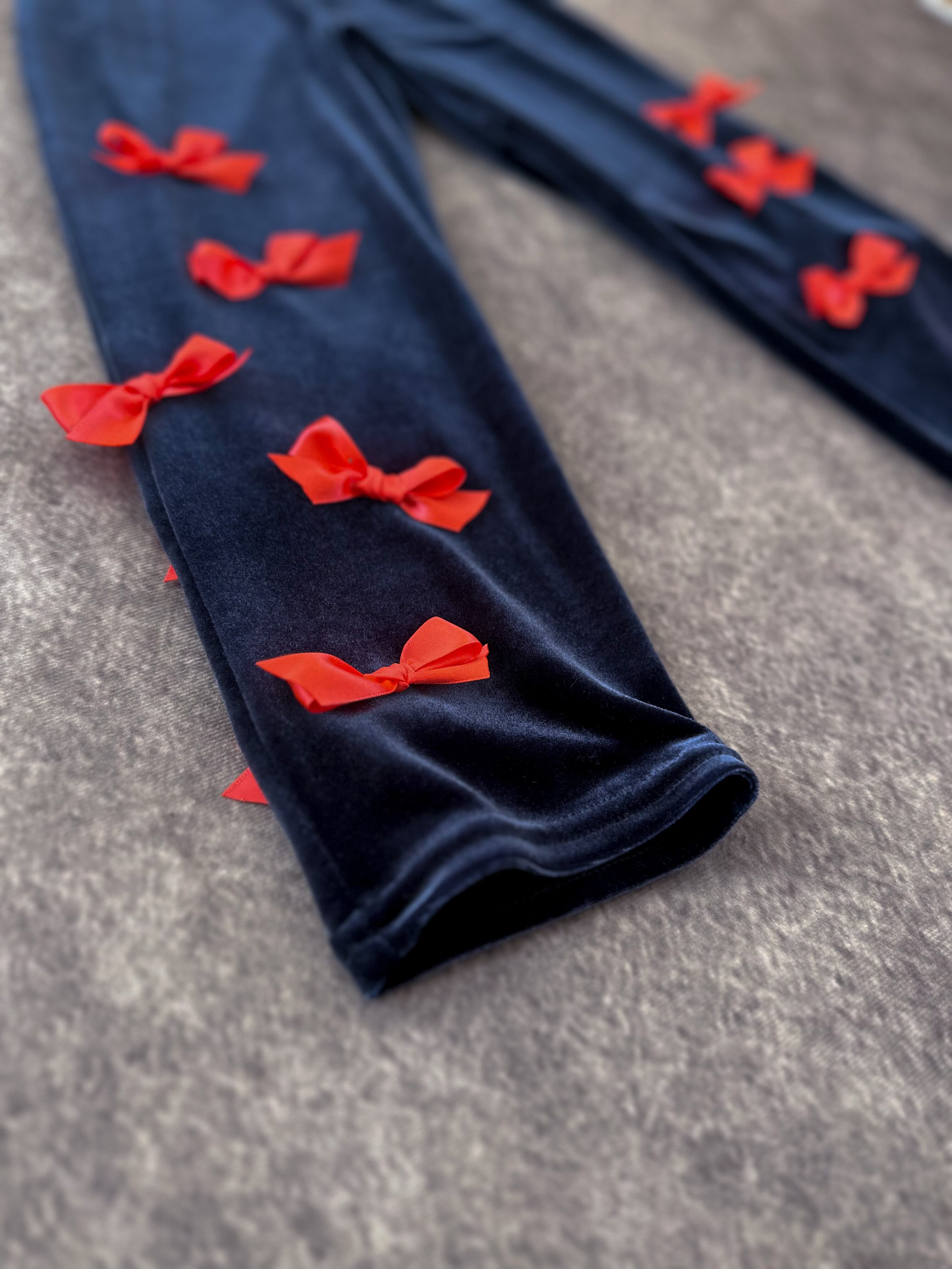 ネイビーのベロアにはネオンオレンジのリボンでキッチュに。