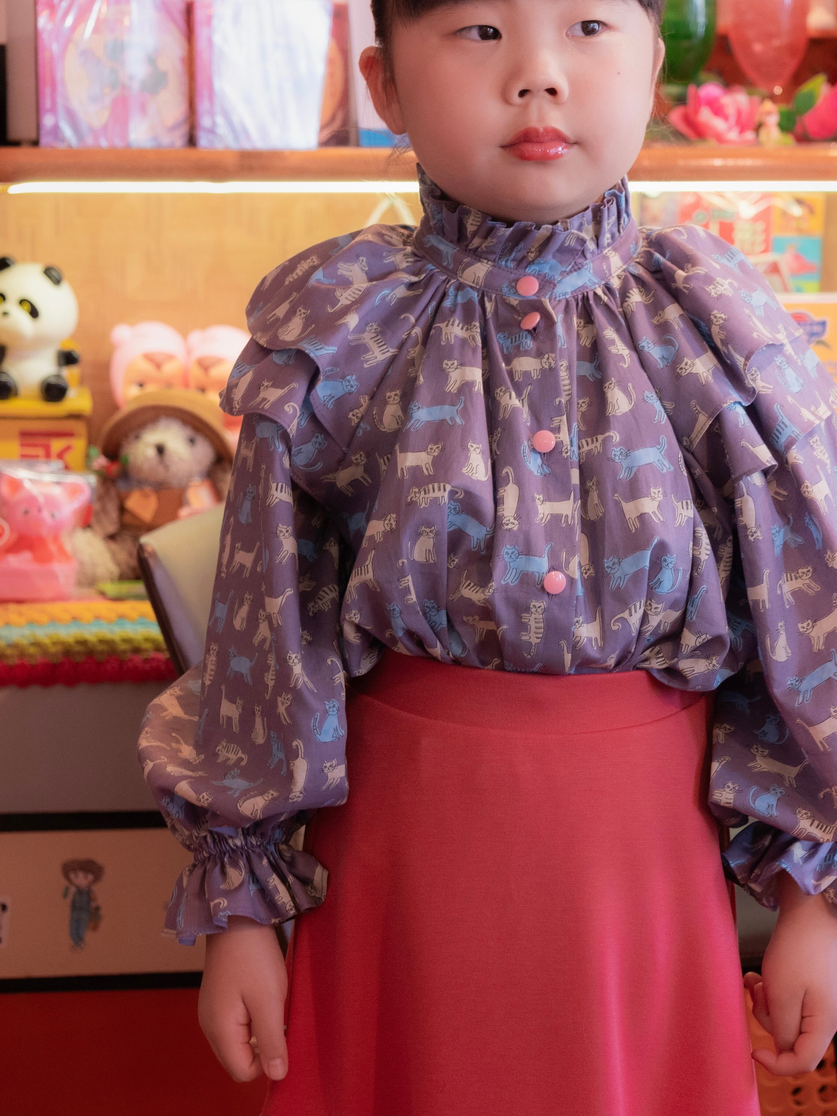 ねこ柄プリントがほんわかした気持ちになる、kiki-habit定番型ブラウスのねこ柄バージョンです。
