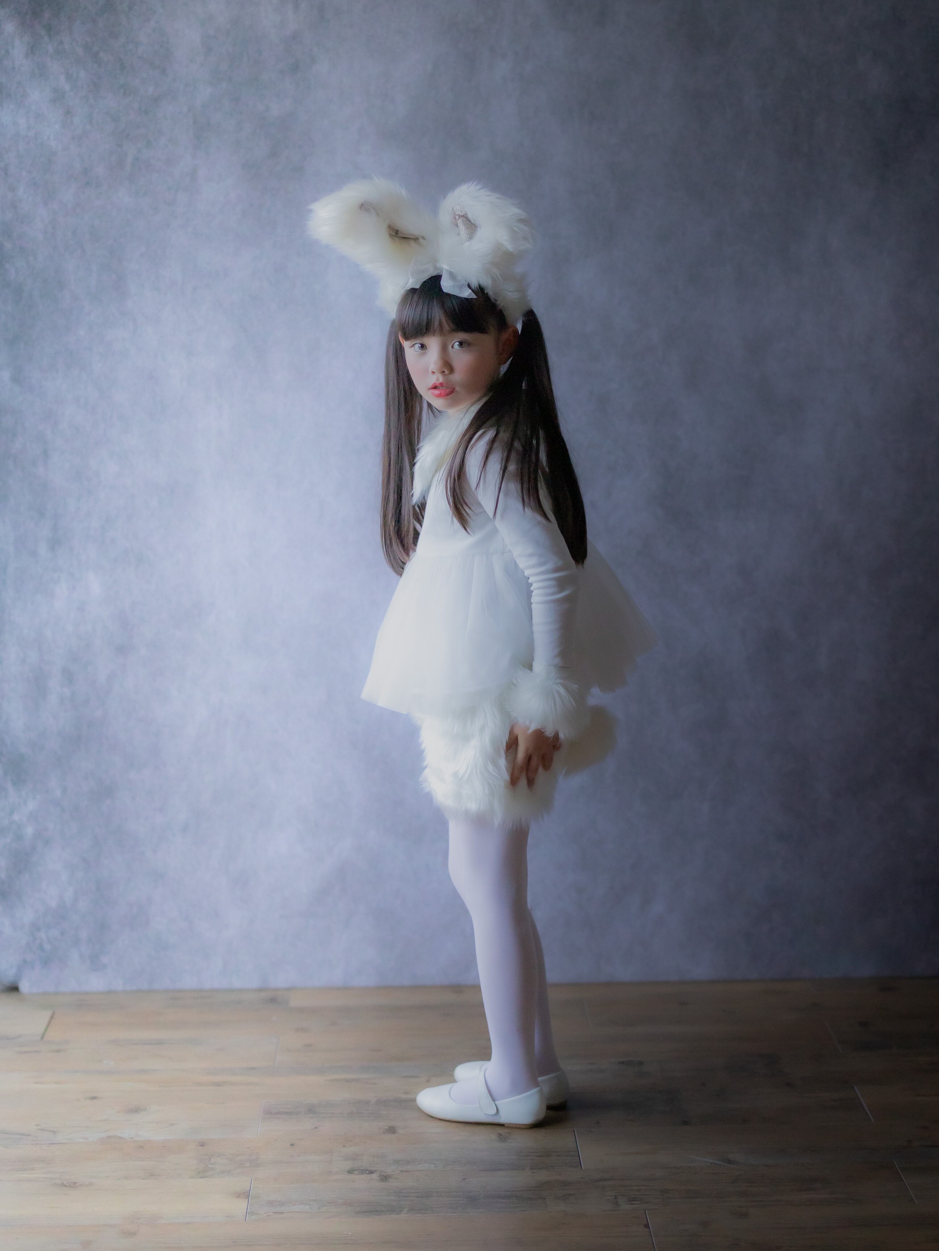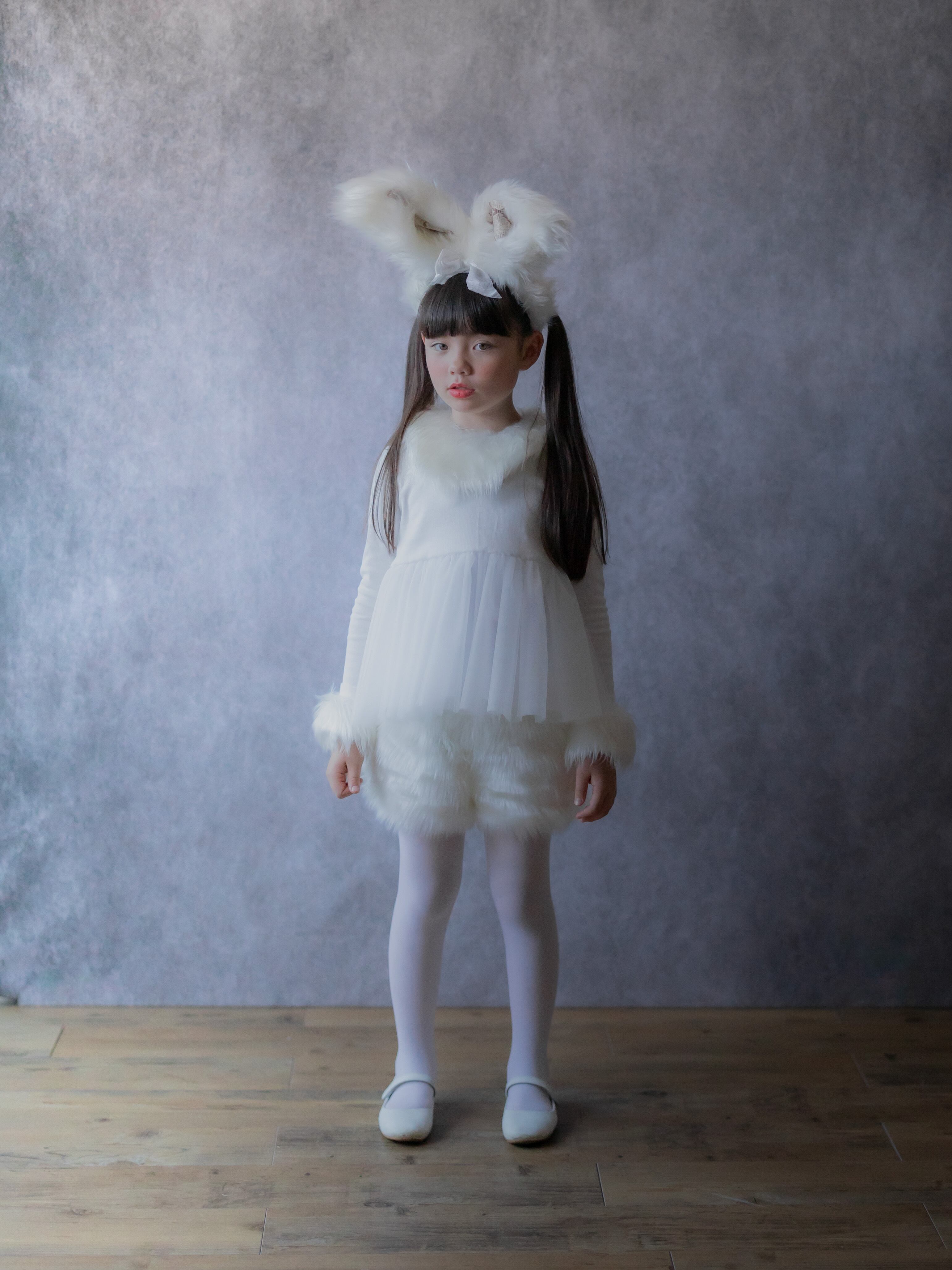うさ耳、チュチュトップス、アームファー、ファーパンツ、ファーティペット、ポンポンしっぽの6点セットです。