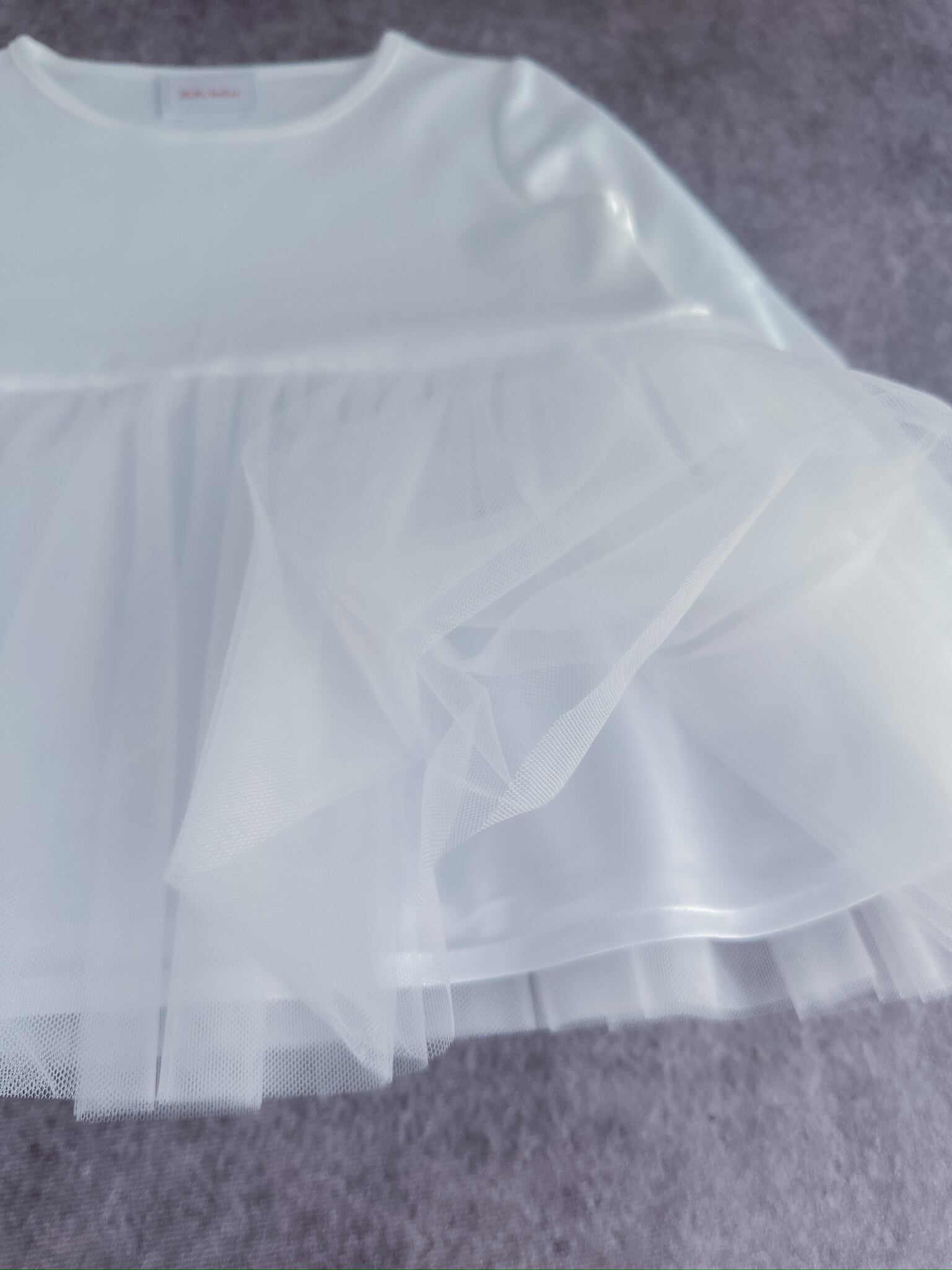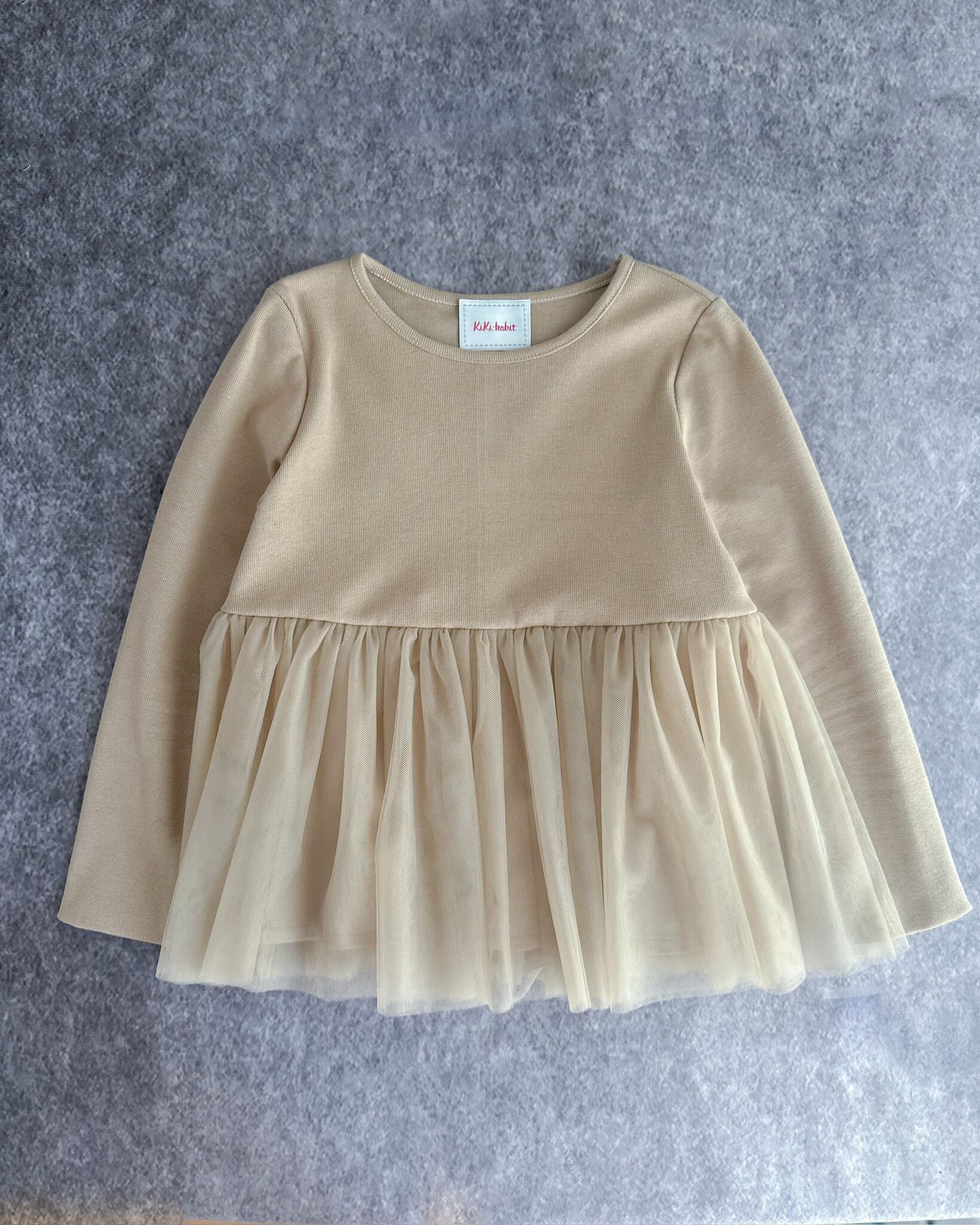 バレリーナのチュチュのような、ふんわりとしたチュール素材のギャザーフリルが、上品で可愛らしいトップスです。身頃部分は肌触りの良いフライス地を使用。着心地の良さと華やかさを兼ね備えた、優秀な一品です。